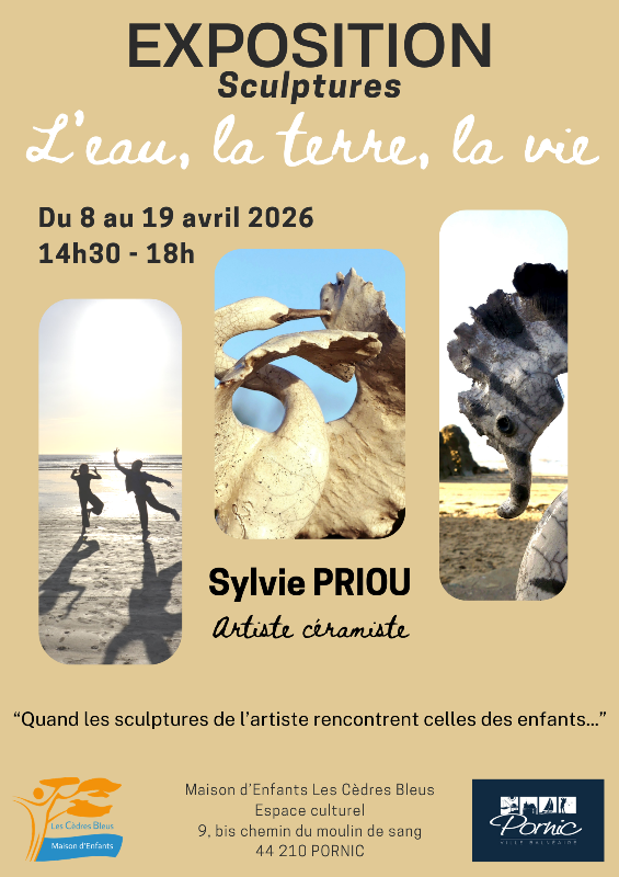 Cette année, c’est l’exposition sculptures « L’eau, la terre, la vie », projet porté par Sylvie Priou, artiste pornicaise, qui se déroulera du 8 au 19 avril 2026, de 14h30 à 18h.