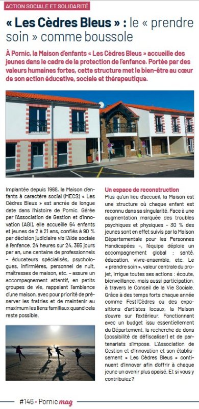 Ce mois-ci, le magazine de la ville de Pornic consacre un article à la Maison d’Enfants Les Cèdres Bleus et à ses missions essentielles au service des familles et des enfants accompagnés.